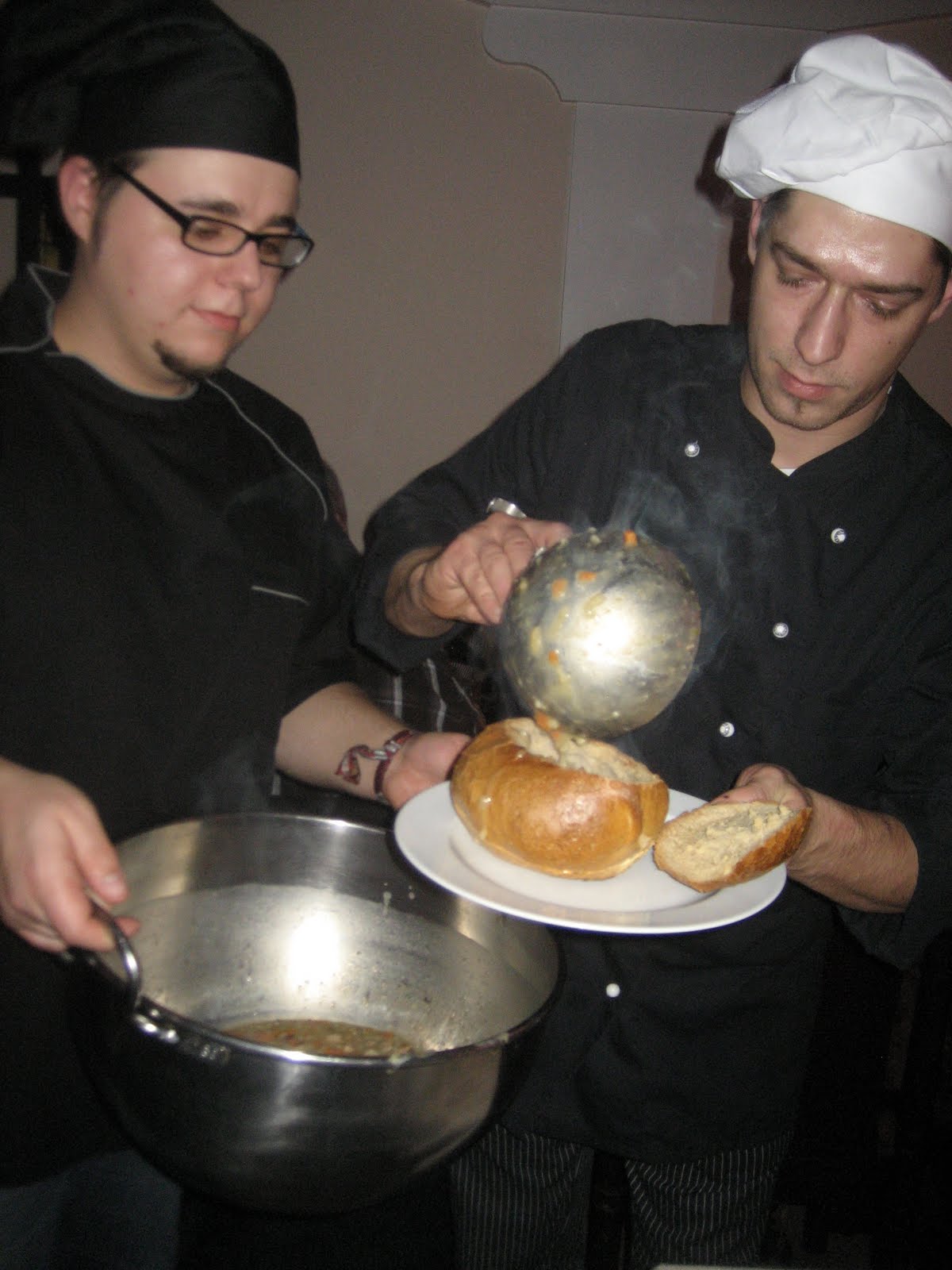 Hier die "Küchenjungen", die die leckere Graupensuppe in die Brotschüsseln füllen.